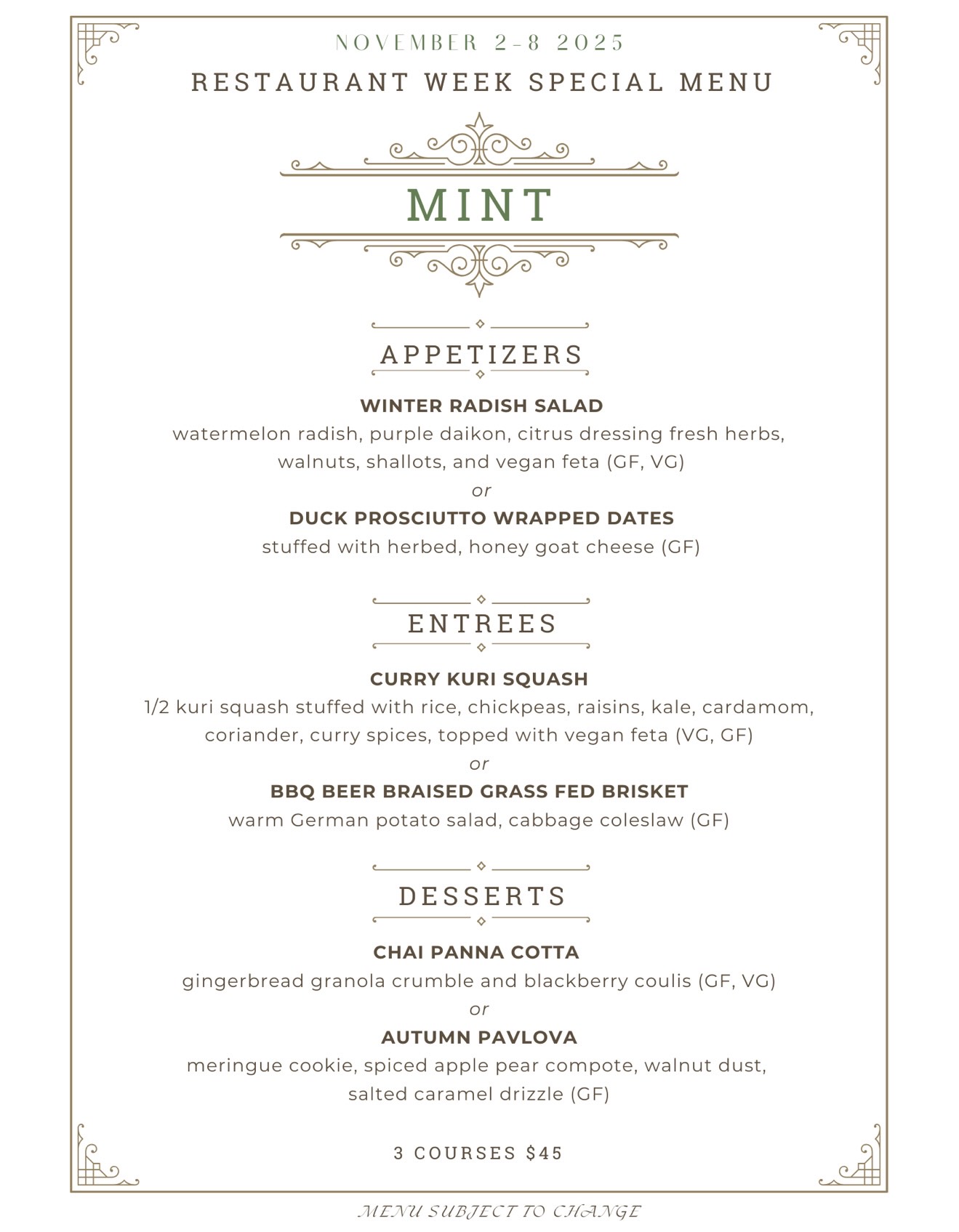 Take advantage of great dining deals with restaurants offering 3-Course prix-fixe dinner menus at 3 different price points: $25/$35/$45